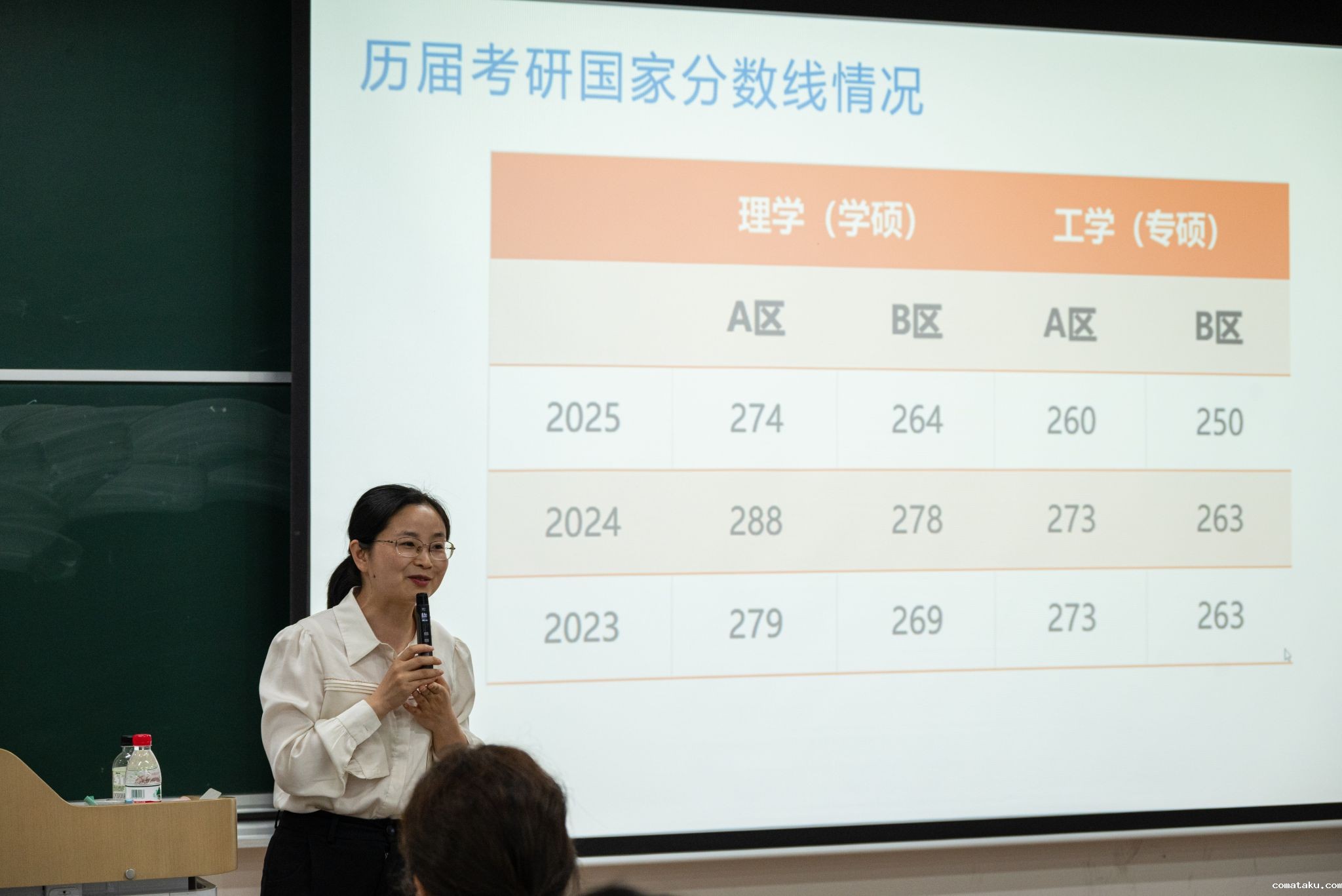 张姗姗从毕业生规模、起薪与学历的关系等方面分析了当前的就业形势,指出硕士学历在就业中的优势。她详细解读了历年考研国家分数线、34 所自划线院校复试分数线以及近三年报考院校成功率等数据,为同学们提供了全面的考研情况参考。同时,她还介绍了学院的考研出国相关奖励政策,并给出了择校与专业报考的建议,提醒同学们要根据自身情况,合理选择院校和专业,避免盲目报考。