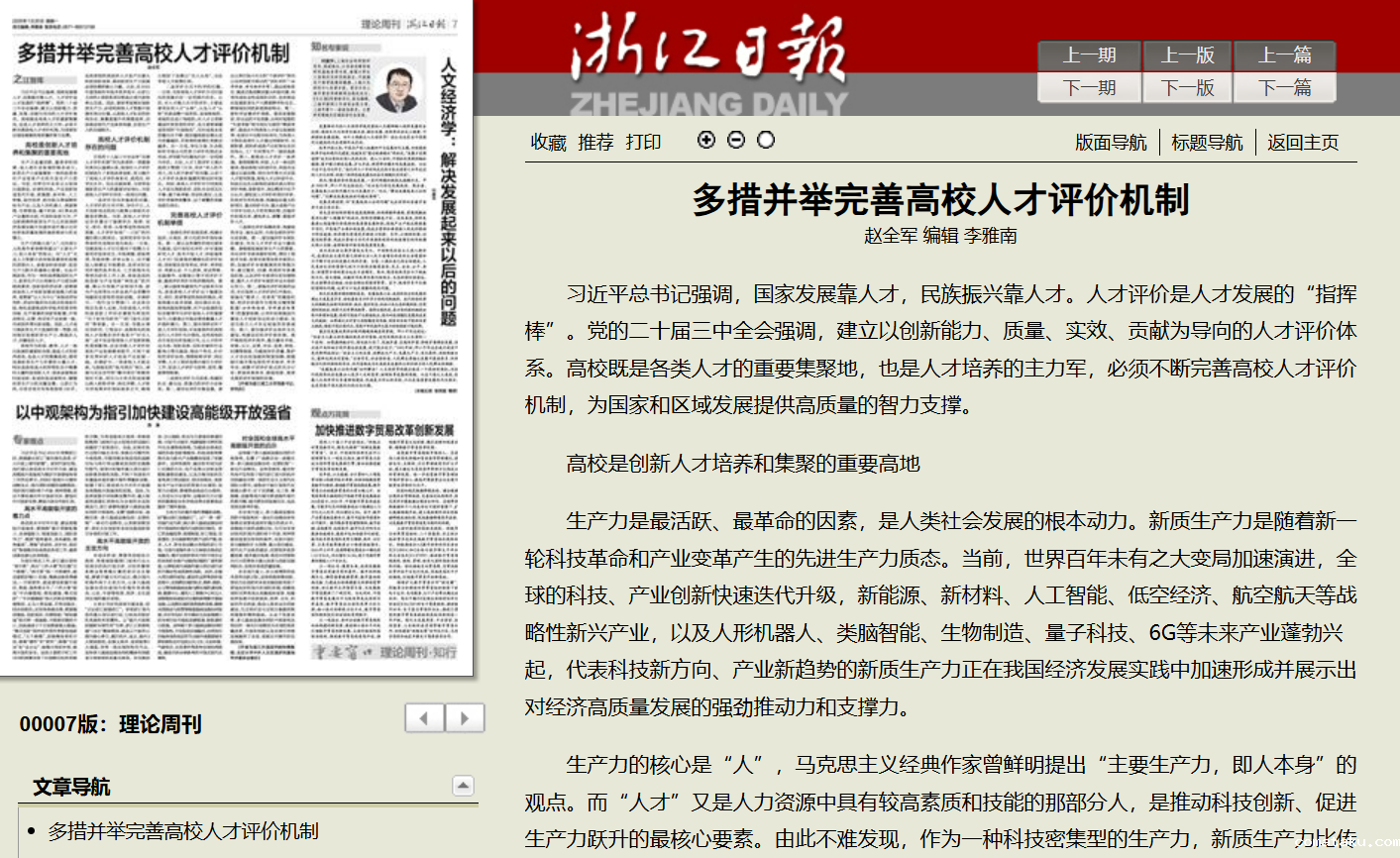 1月20日,《浙江日报》理论版头条刊发AC米兰官方党委书记赵全军理论文章《多措并举完善高校人才评价机制》。